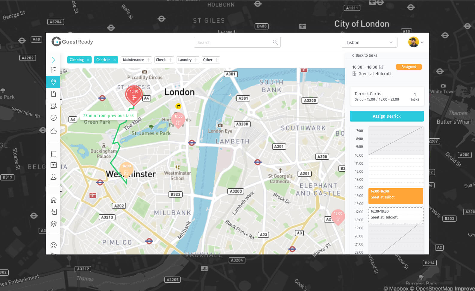 - Assigning a task from start to finish for each type of the task (check-in, maintenance, cleaning)